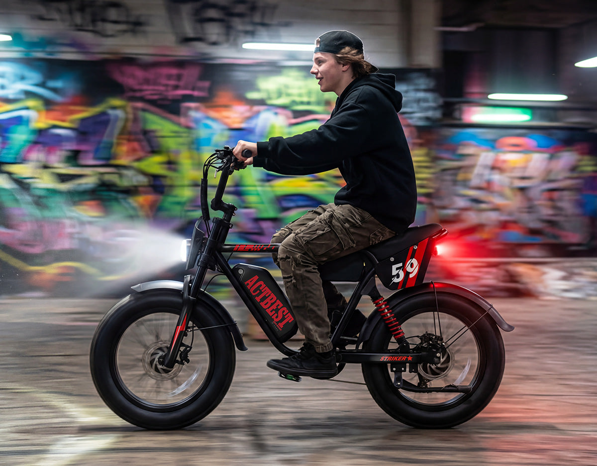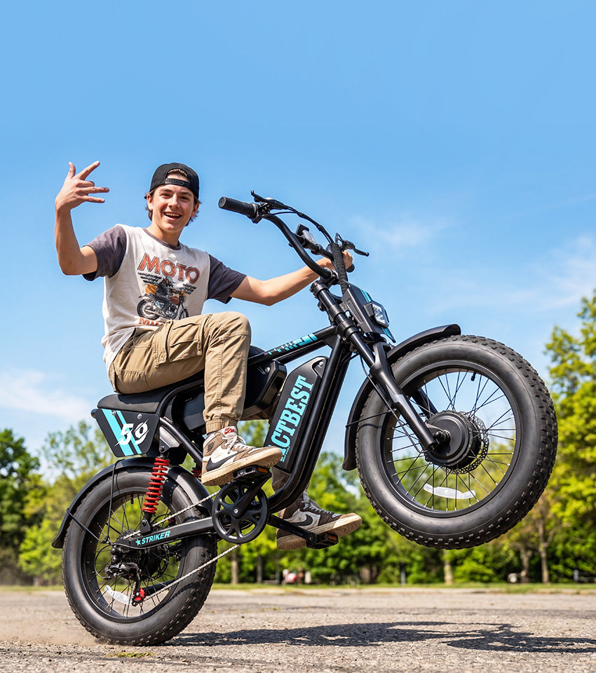Not at all! The Striker Max is a full-size, heavy-duty electric motorbike. Weighing in at robust 109.8 lbs, it features a highly stable, structurally reinforced frame and an extended moped-style bench seat. It’s built to provide a commanding street presence and a comfortable ride for adults of various sizes.
