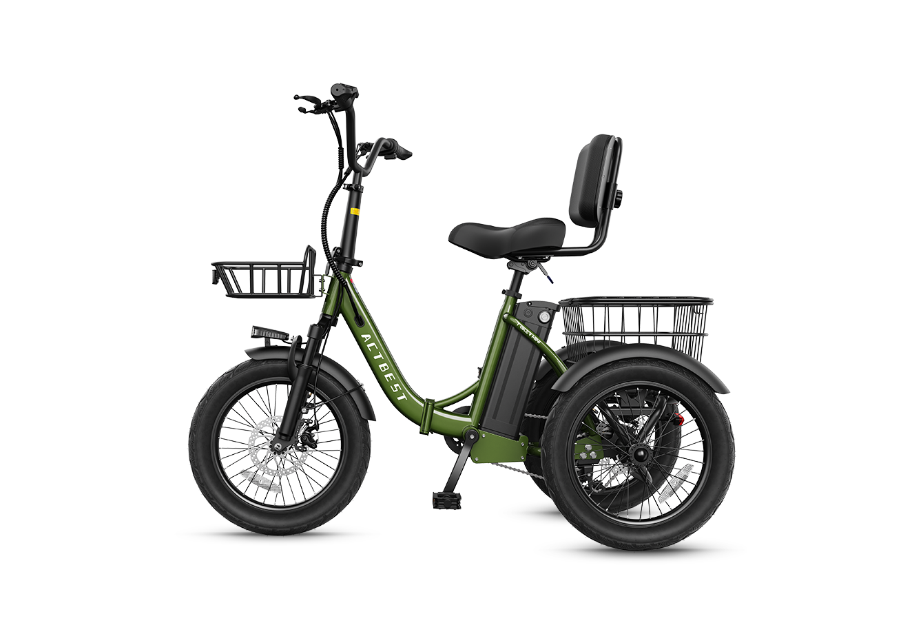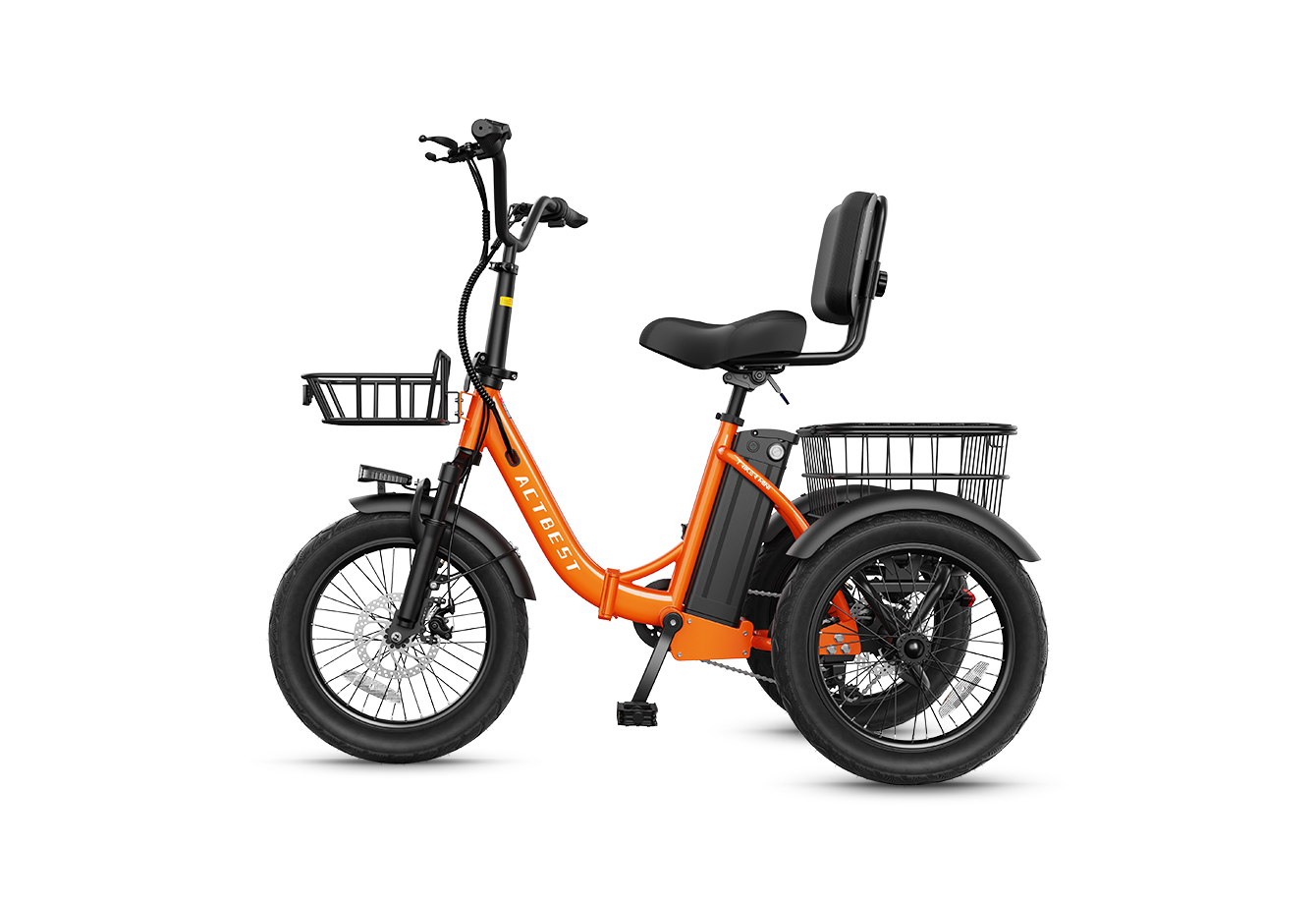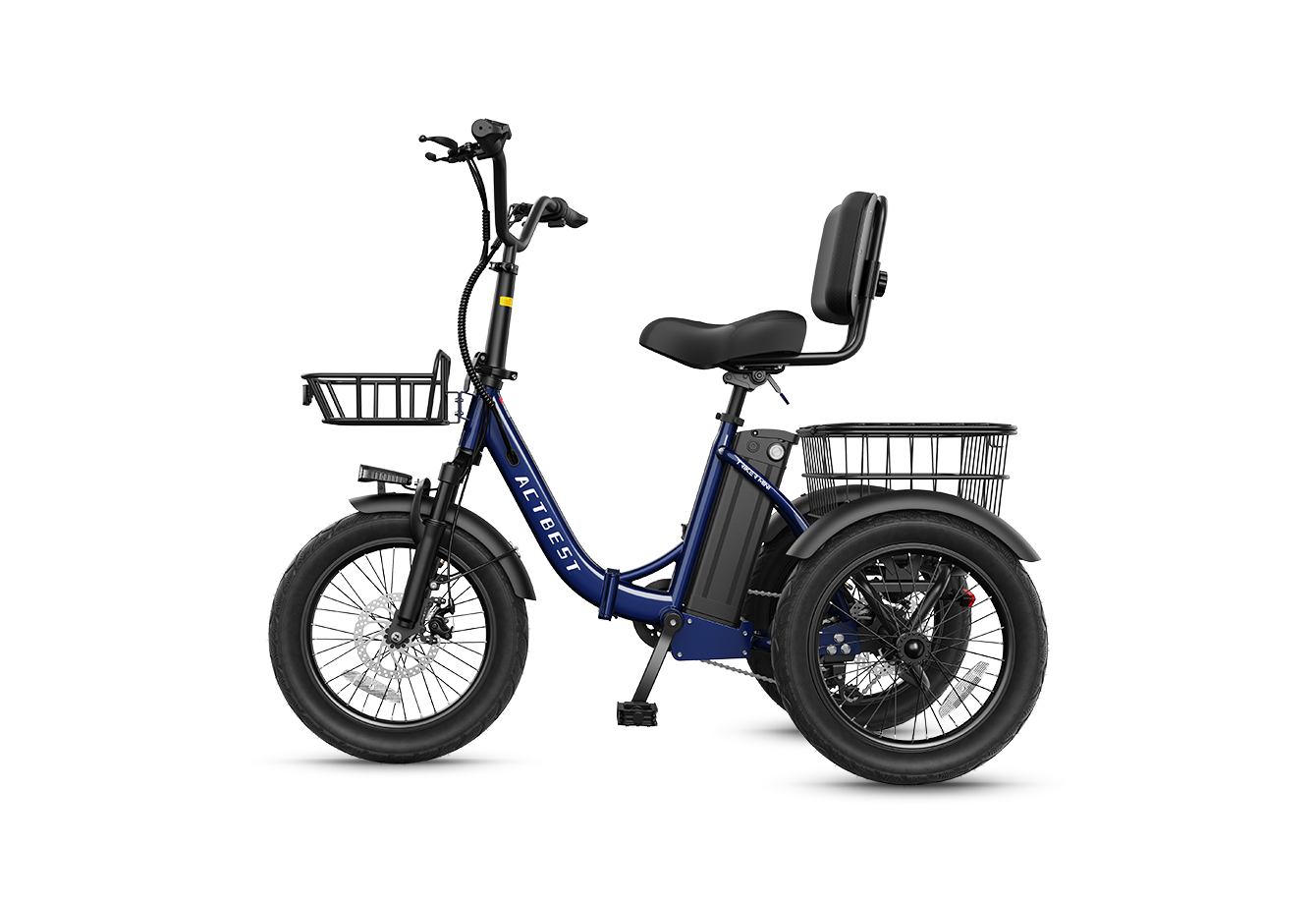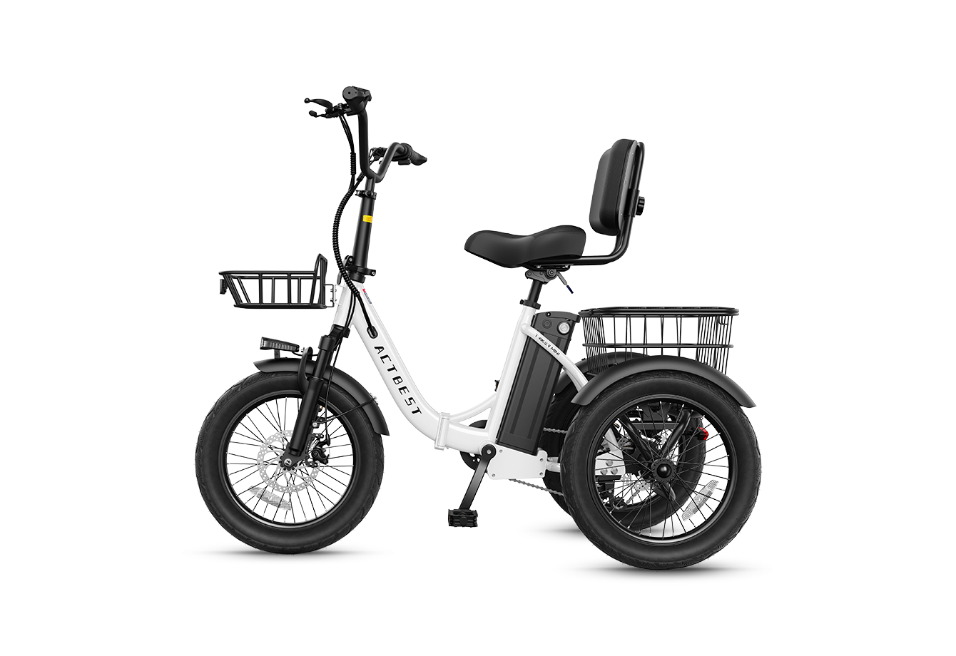 Discover the Actbest Triker Folding 3-Wheel Electric Bike, engineered for power, stability, and everyday comfort. The upgraded 48V system delivers ~30% more power than standard 36V e-bikes, fueled by a 350W brushless motor with up to 1200W peak output for smooth acceleration and confident hill climbs. A 48V 10.4Ah removable battery provides a real-world range of up to 55 miles, making it ideal for daily errands and casual rides.